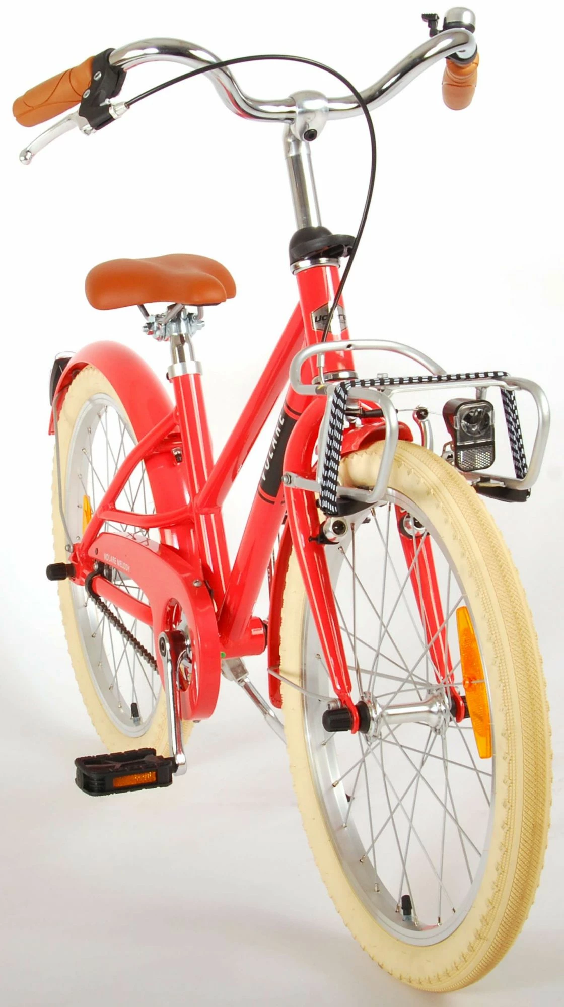 Volare børnecykel designet i et flot retrotema med frontbagagebærer.