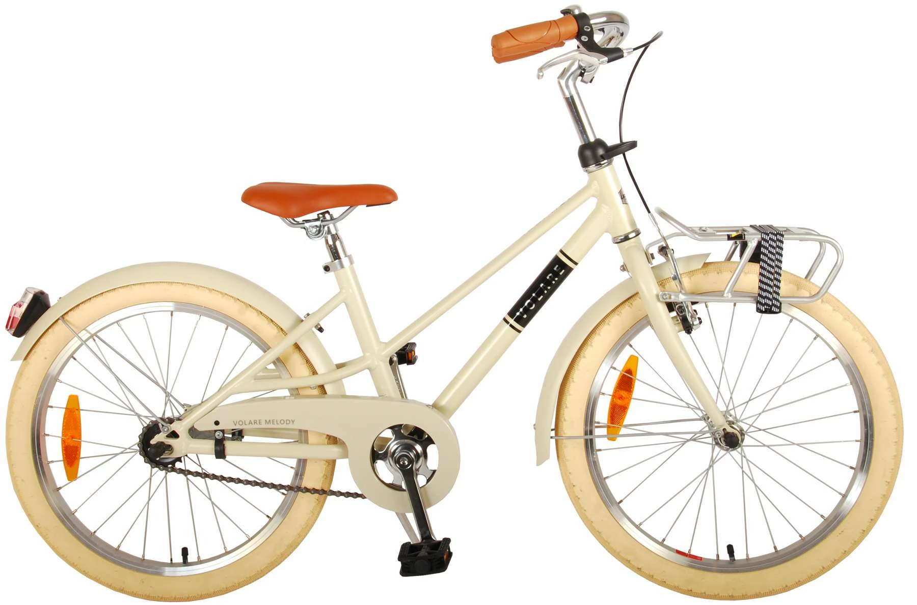 Volare børnecykel designet i et flot retrotema med frontbagagebærer.